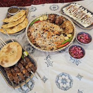 3 پرس برنج قابلی + 250 گرم گوشت بره + 6 سیخ کباب تکه + 1 عدد ران مرغ سرخ شده + 4 عدد منتو + 3 عدد بولانی + ترشی کلم + فلفل تازه + نارنج + نان